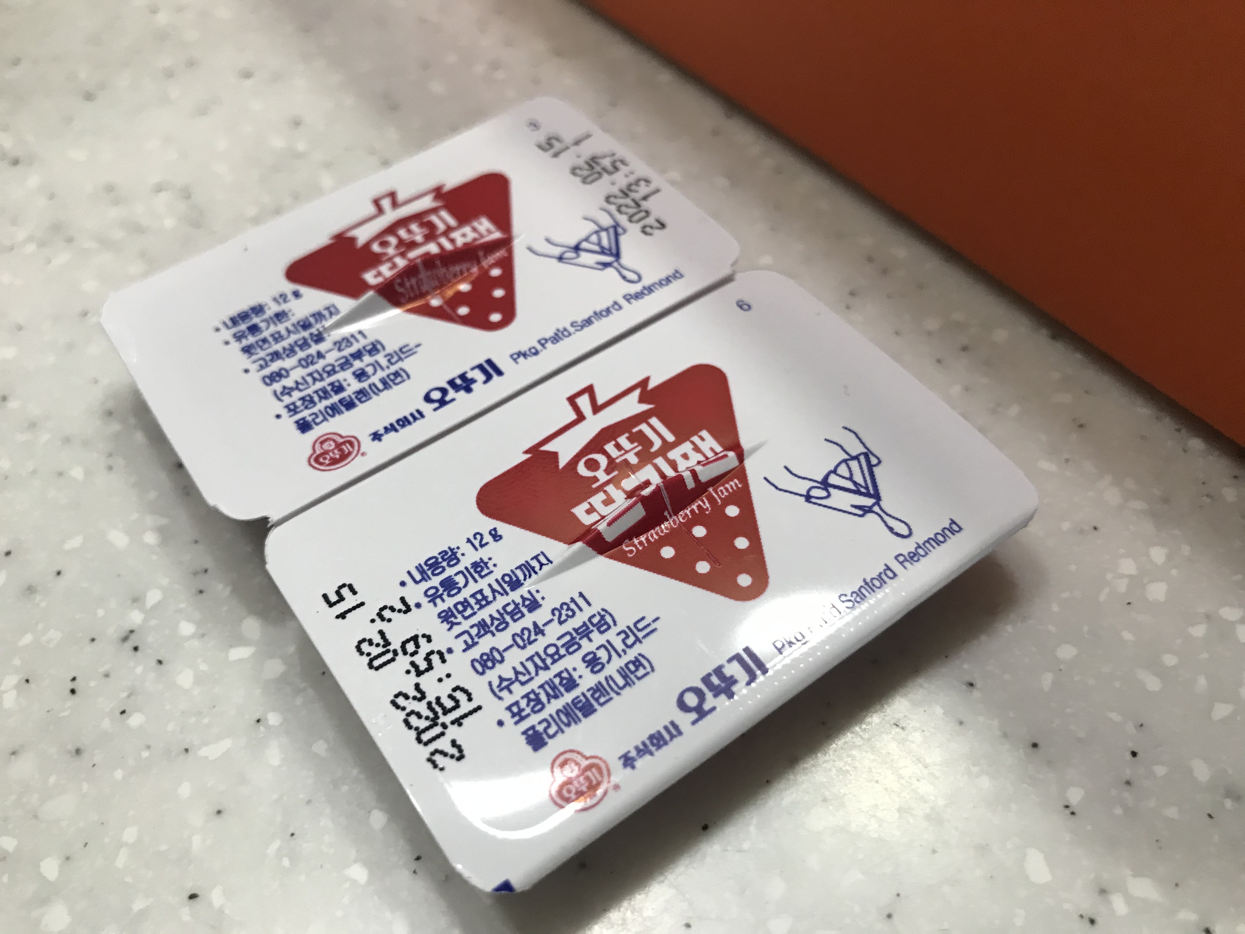 그리고 두툼한 빵을 그냥 먹기엔 살짝 아쉬운 맛일 수도 있는데 함께 주는 '오뚜기 딸기쨈'이 신의 한수인 것 같다.