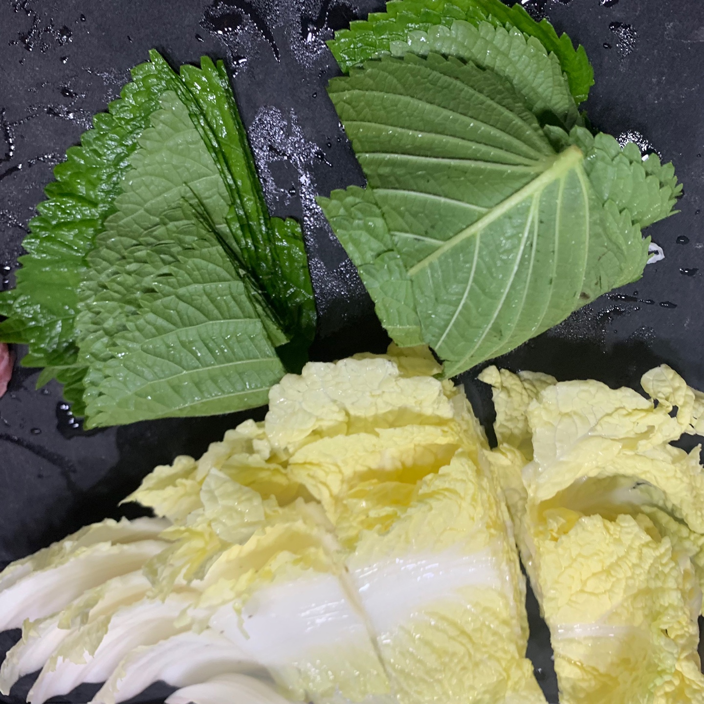 야채는 씻고 배추와 깻잎은 3등분 정도 잘라 고기와 차곡차곡 쌓아주면 되기 때문이죠.