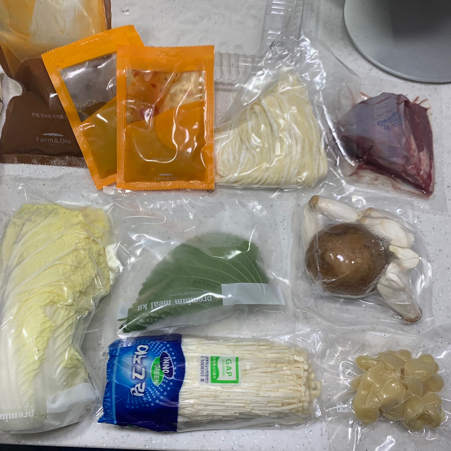 내용물은 위 왼쪽부터 샤브용 육수, 초간장 소스, 칠리소스, 칼국수 면, 소고기, 배추(배추 밑에 청경채가 함께 들어있어요), 깻잎, 팽이버섯, 표고버섯, 새송이버섯, 감자수제비로 구성되어 있습니다.