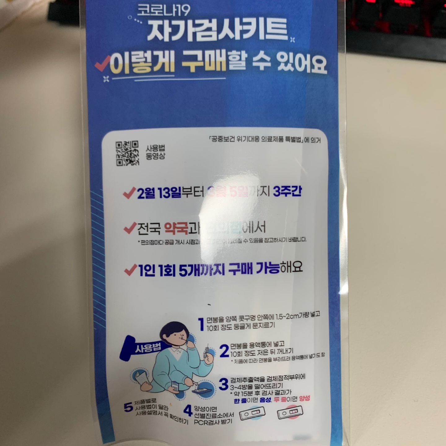 불과 몇 개월 전에는 직접 보건소를 방문하고 검사 결과를 다음 날 통보 받는 형태로 진행되었는데.. 이제는(일시적으로)가까운 편의점, 약국 등에서 자가검사키트를 구매해 직접 체크할 수 있다고 한다.
