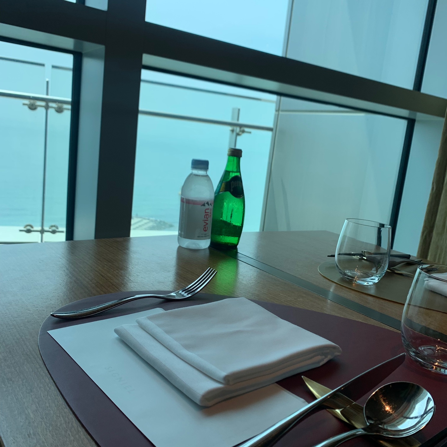 자리에 앉으면 이미 세팅이 되어 있습니다. 수저와 냅킨 그리고 탄산수와 생수, 아직 코로나 시국인 만큼 비닐장갑도 준비되어 있어요. 음식을 가지고 올 때만 비닐장갑을 양손에 끼고 가시면 된답니다.