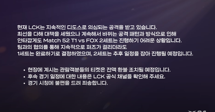 지난 25일(일) DRX와 디플러스 기아와의 경기 과정에서 무려 8번의 퍼즈가 발생할 만큼 '핑 이슈'가 발생하였고, 추후 공식 공식 채널을 통해 디도스로 의심되는 공격에 대한 첫 언급 사례가 되었다.