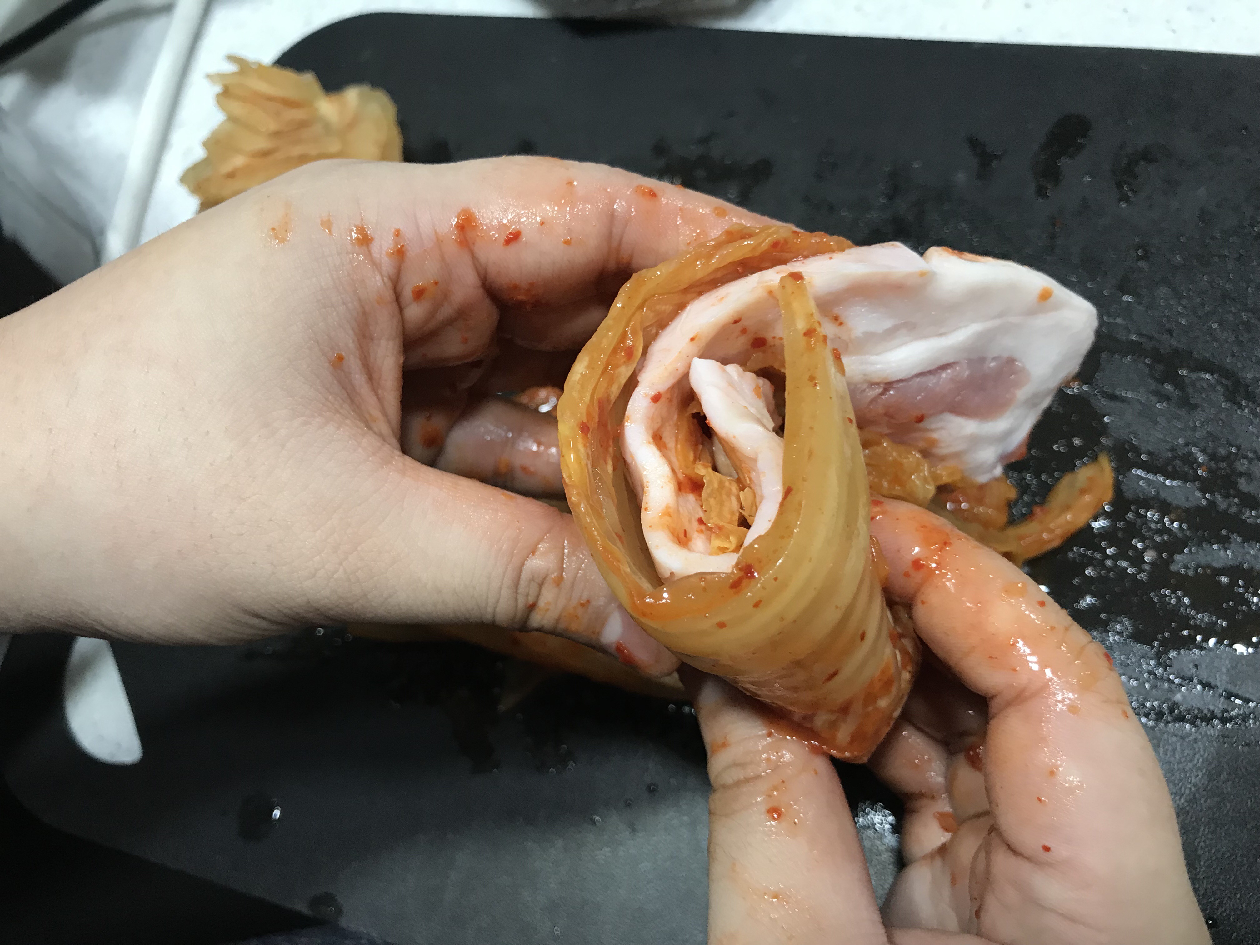 비슷한 길이로 잘라 김치와 김치 사이에 돼지고기를 넣고 가볍게 말아줍니다. (돌돌돌)