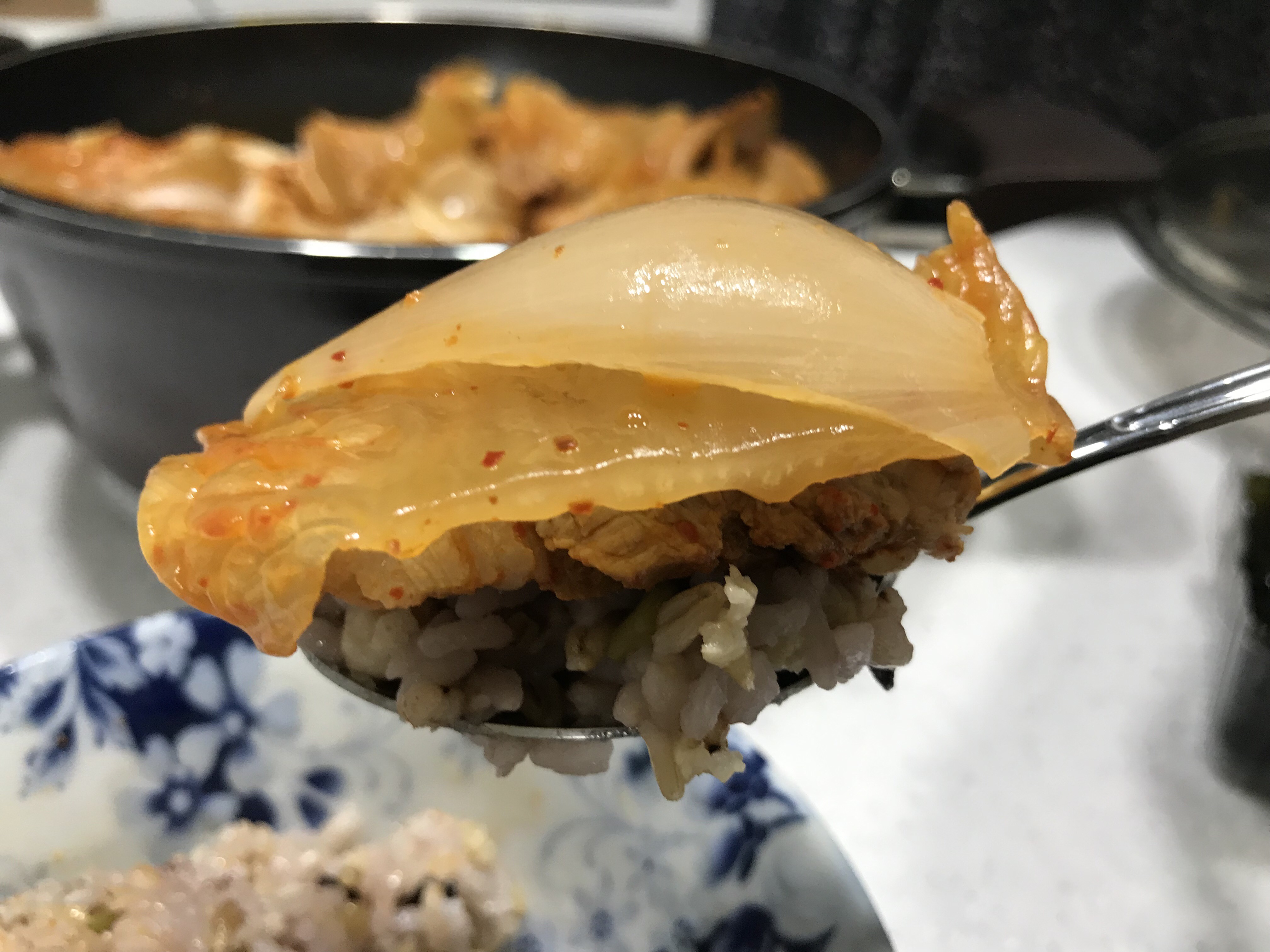 고기와 김치, 그리고 양파를 동시에 올려 한입에 먹었는데요.
