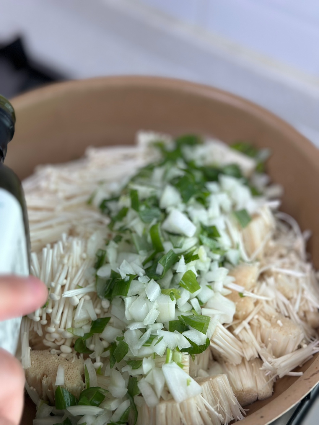 1. 양파 반개를 깍둑썰기 해준 후, 팽이 버섯, 대파 등을 을 한입 크기로 썰어 준비한다.