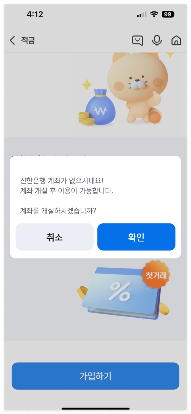 상품을 선택하면 간단한 소개가 나오는데 만일 신한은행 계좌가 없는 고객의 경우에는 신규 계좌 개설 안내가 먼저 표기되니 놀라지 말고 계좌를 생성하면 된다.