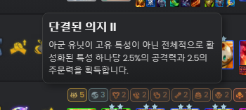 위에 언급한 빌드 과정에서 '단결된 의지'가 양각을 보기에 아주 좋은 증강체이다. 아래 사진과 같이 엄청난 량의 시너지를 추가로 받을 수 있기 때문에 정말 좋은 효과로 생각된다.