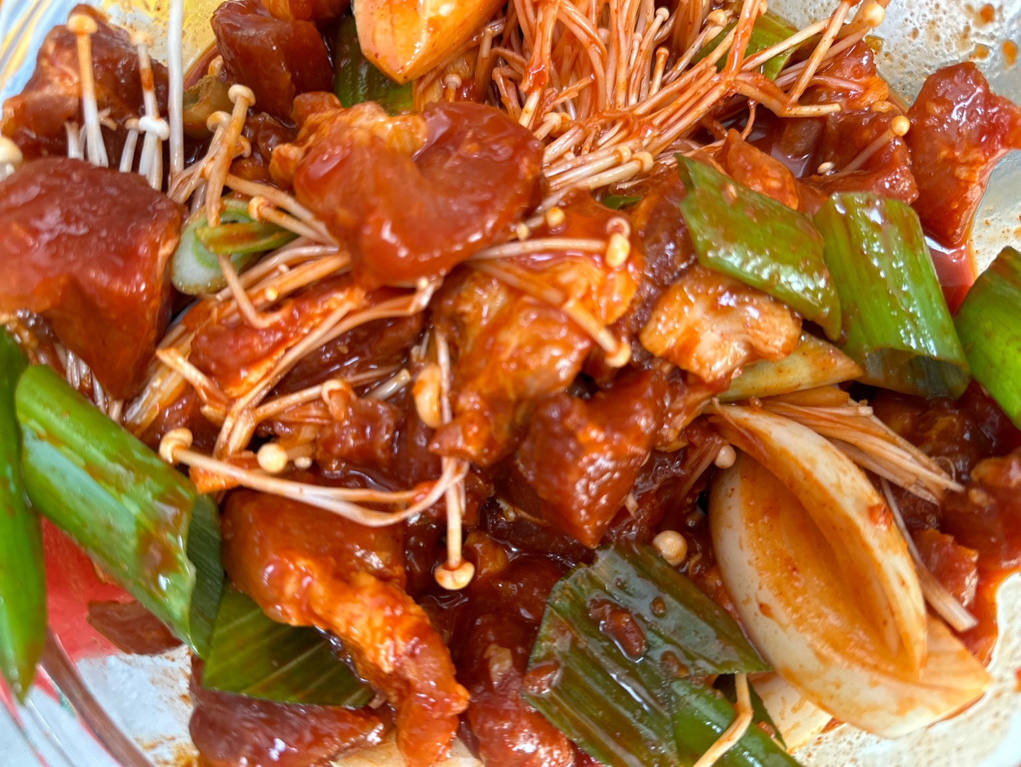 | 재료 | 돼지고기(앞다리살), 제육볶음 양념, 다진 마늘, 대파, 팽이 버섯 등.. |