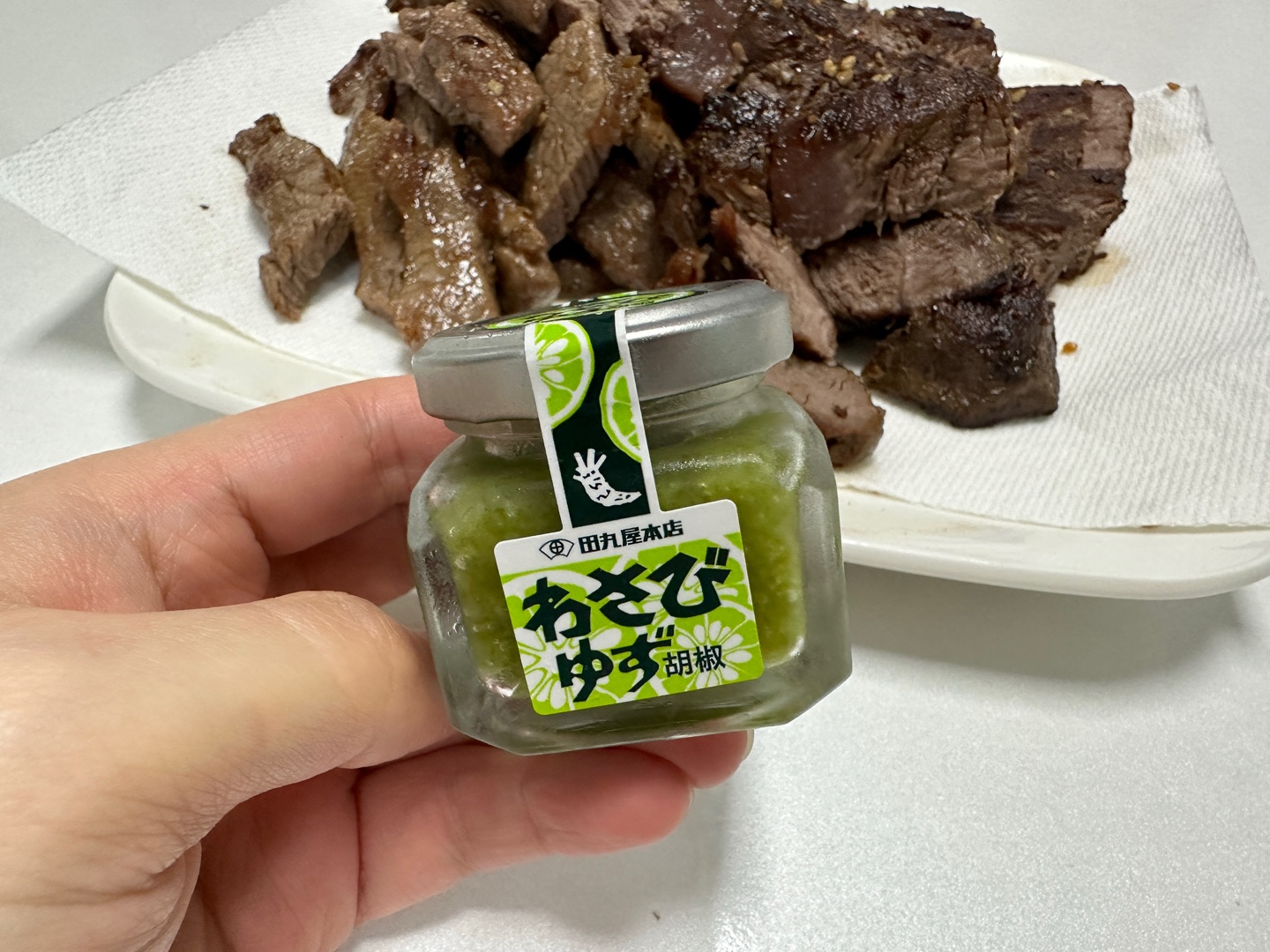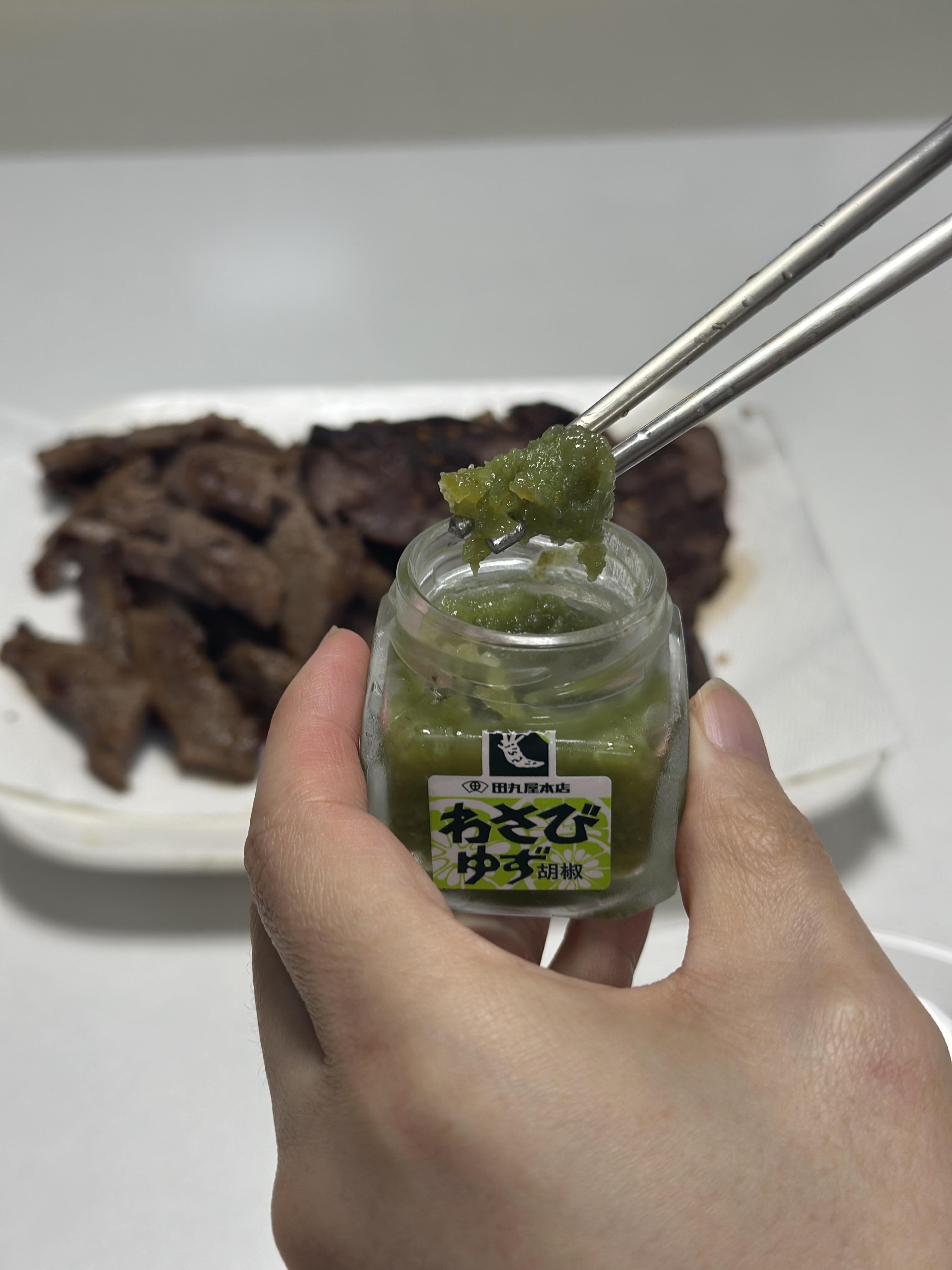 그리고 와사비를 앞접시에 먹을 만큼 덜어낸 후 고기에 올려보았습니다. 처음으로 먹어보는 유자맛의 와사비인데.. 과연 어떨지요?!!
