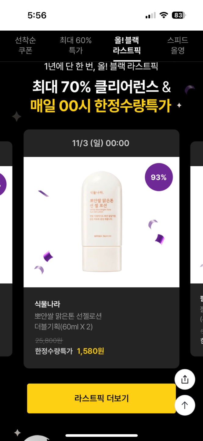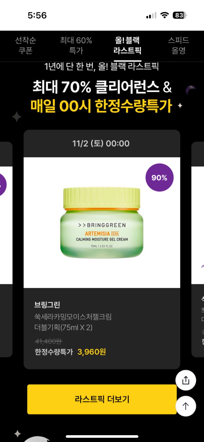 그런 곳에 빠질 수 없는 저와 아내도 열심히 동참 중에 있습니다. 양심상(?) 쿠폰까지는 욕심 낼 수 없는 상황이라 00시(자정)에 '올!블랙 라스트픽'에 참여하고 있습니다. 그리곤 피곤하니 후딱 오픈런 하고 취침 모드에 들어갑니다...^^;