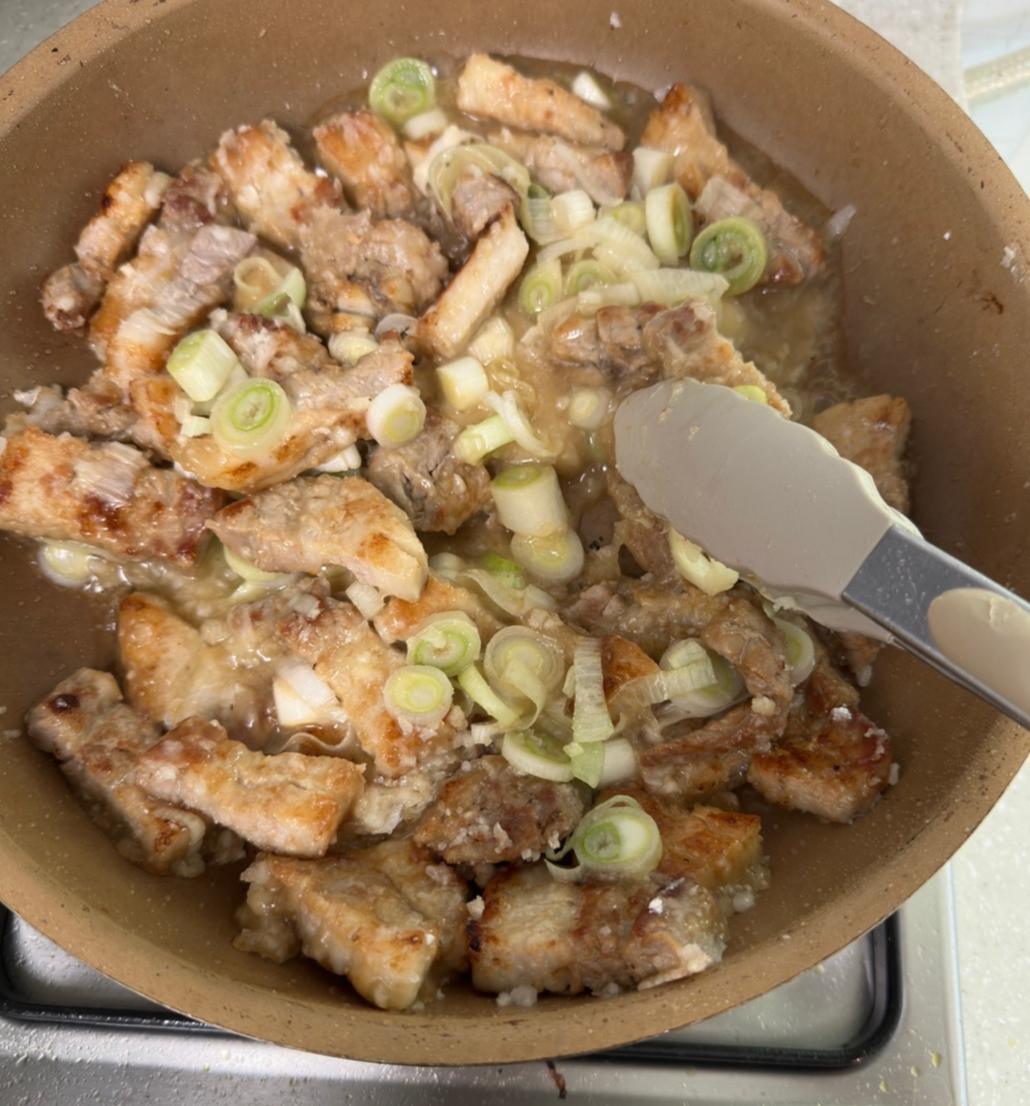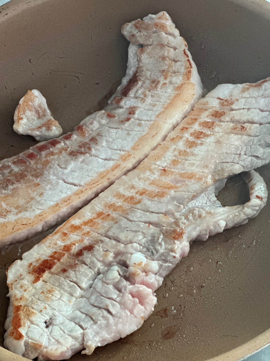 Step 1. 먼저 고기(삼겹살)를 프라이팬에 잘 구워줍니다. 링크로 첨부된 영상을 보시면 성시경님께서는 대패삼겹살을 추천하지만 저희는 두꺼운 삼겹살 밖에 없는 관계로 그냥 이대로 진행해보았습니다.