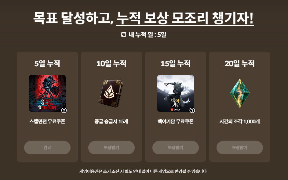 - 이벤트 페이지로 이동하여 출석 보상을 수령합니다.
