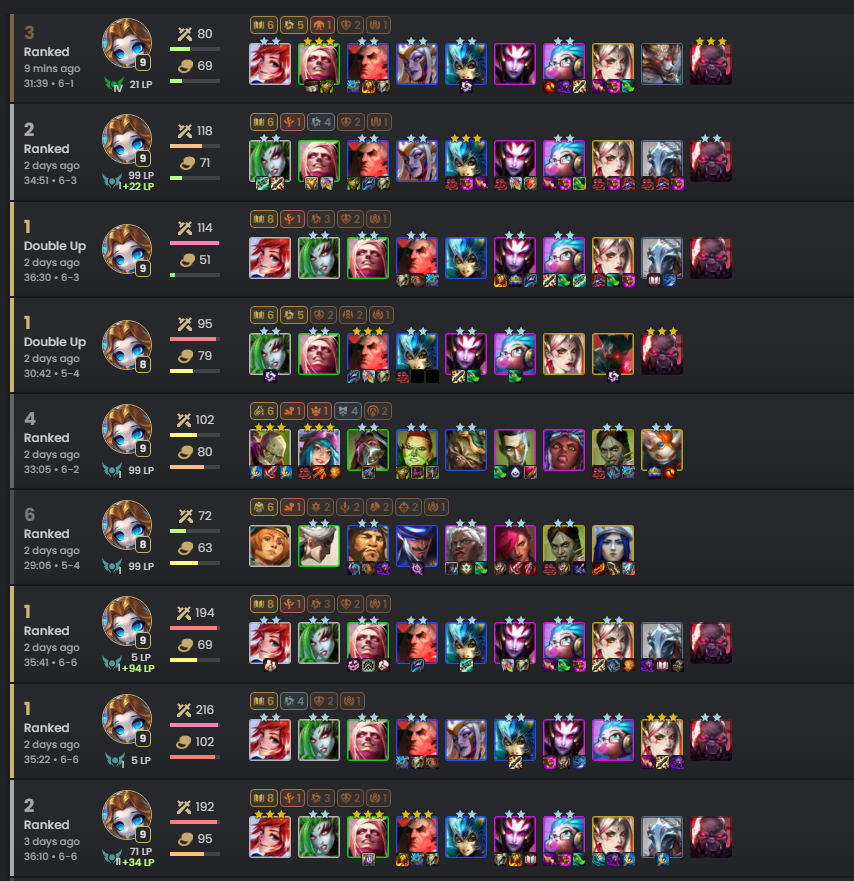 편집없이 '플레티넘 ~ 에매랄드' 구간에서 사용한 이력입니다. 마지막 3위는 증강체를 잘못 선택해서 하나 없이 게임해서 아쉽게 3위이고.. 조이가 늦게 붙는 바람에 아이템이 르블랑한테 먼저 들어갔네요. 흑흑