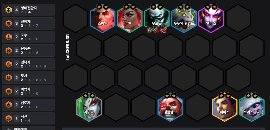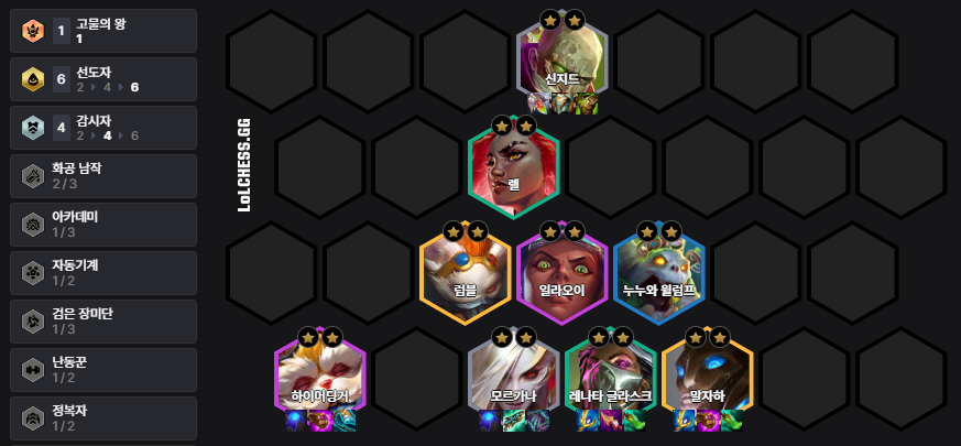 레나타가 잘 나오지 않는 상황에서 '신지드'와 '모르가나'가 잘 붙는다면 이것만 3성 찍고 하이머딩거나 말자하 찾으러 8렙 가는 것도 좋습니다. 벡스는 어차피 초반 빌드업에서만 사용되고 딩거와 말자하가 나오면 빠지는 자리이니 3성 안찾으셔도 됩니다.