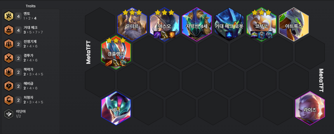 보통 멘토 + 메크(Mighty Mech) 시너지 또는 4 멘토 중심으로 운영. - 주요 캐리