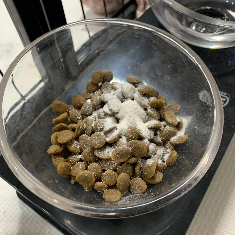인트라젠은 가루 형식이기 때문에 저와 같이 사료와 함께 섞어 먹이거나 간식, 물에 섞어 먹이면 된다고 합니다.