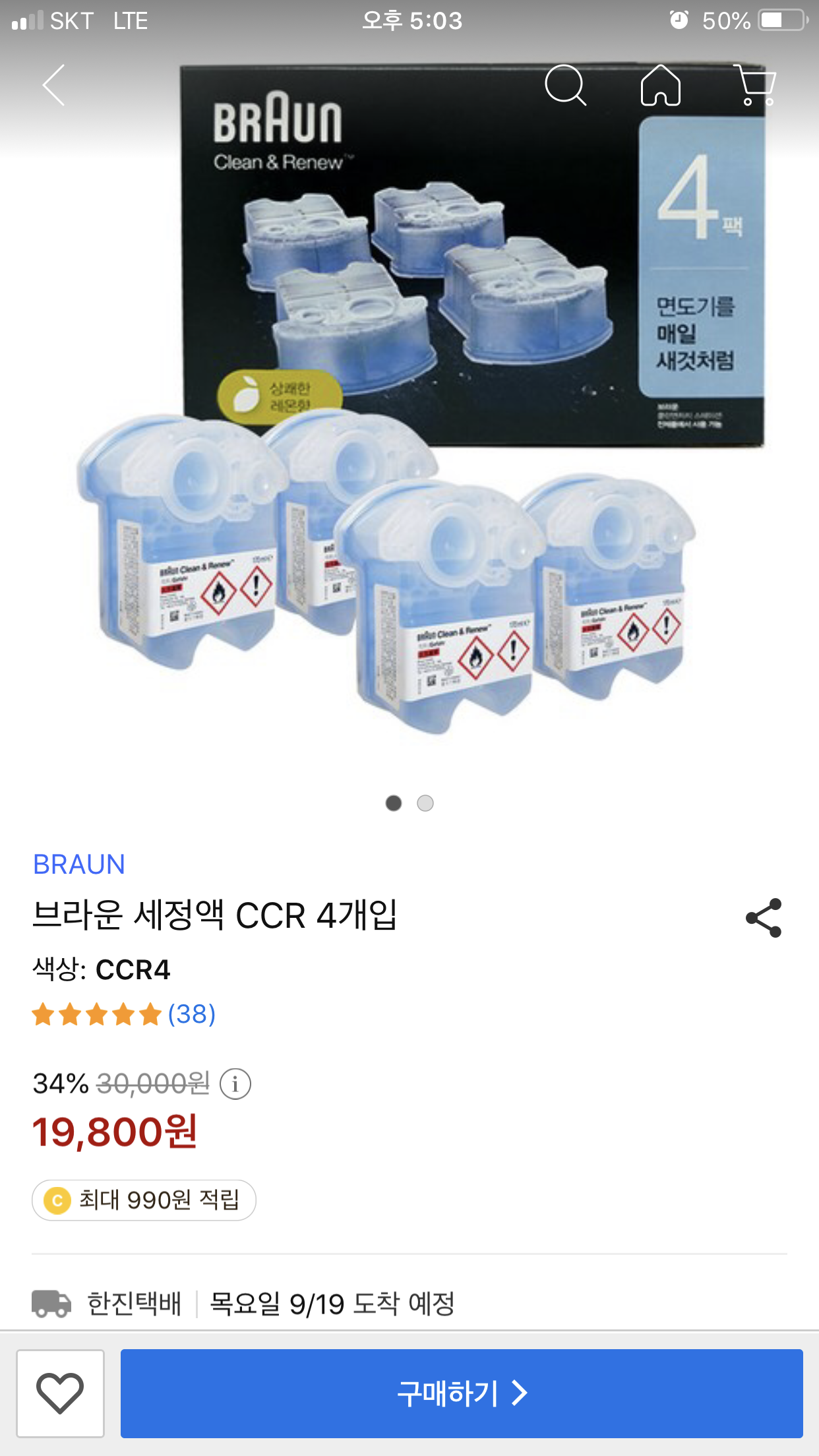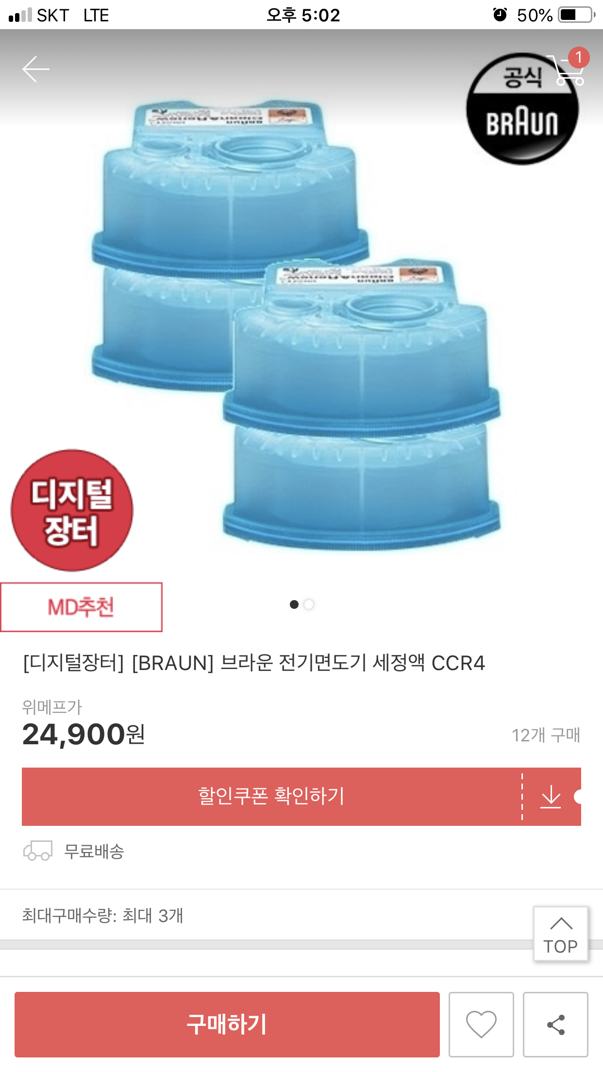 저 저는 '브라운(BRAUN) 전기면도기 세정액 CCR4'을 쿠팡으로 구매하였습니다.
