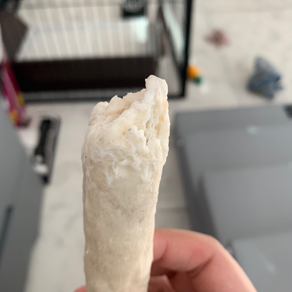 개껌을 씹다 보면 씹은 부분이 촉촉? 해져 사진과 같은 모양으로 변하게 됩니다. 팜내추럴 발포껌 크런치바는 한 개를 주면 먹는데 꽤나 오랜 시간이 걸리기에 촉촉해졌을 경우 먼지가 달라붙기 쉬워 위생적인 부분에 있어서는 좋지 않을 수 있을 것 같아요.