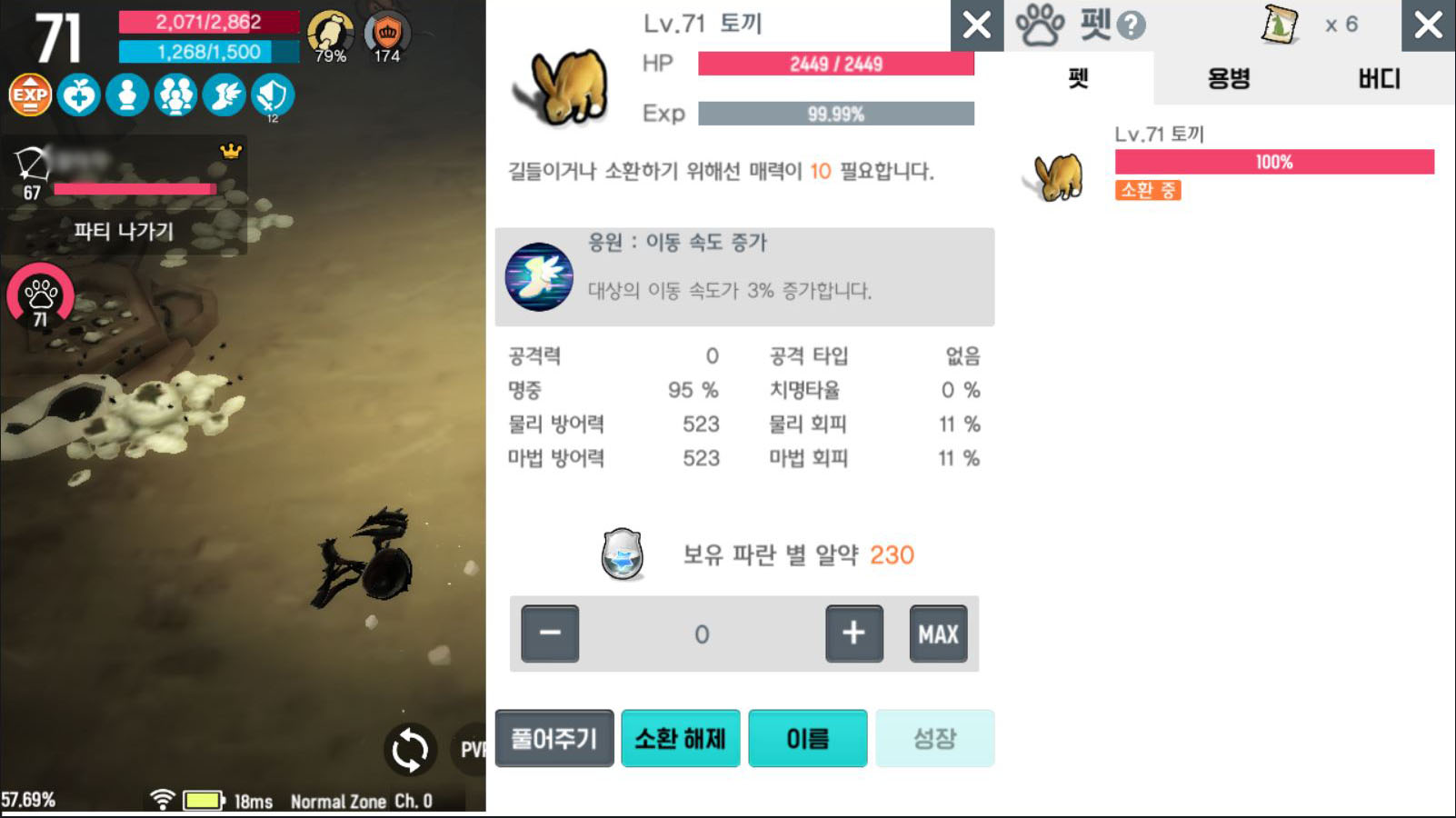 길들이기를 원하는 몬스터의 매력 포인트를 확인 후(도감을 통해 확인 가능) 매력 스탯을 올려 길들이기가 가능합니다. 펫에는 토끼와 같이 버프를 부여하는 펫도 있으나, 직접 전투에 참가를 하는 펫이 있어 어떤 펫을 길들일지 고민하는 것도 하나의 재미요소라고 생각했습니다.