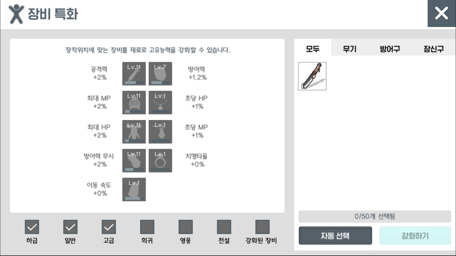장비 특화는 장착 위치에 맞는 장비를 재료로 사용하여 특정 고유 능력치를 강화하는 것입니다. 저는 분해를 하여 재료를 획득하는 것도 중요하고 특화도 일정 레벨은 필수로 올려주어야 하는 것이라고 생각되어 사냥을 통해 획득한 장비를 어떻게 써야 할지 고민이 많았습니다. 여러분들도 장비 아이템은 등급에 관계없이 알차게 사용하시길..!