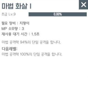"마법 화살" 스킬은 단일 공격을 하는 스킬이나, 재사용 대기 시간이 무척 짧고 MP소모량이 적기 때문에 효율이 좋습니다. 현재 9 레벨까지 올려둔 상태로 스킬을 사용하면 몬스터에게 강한 한방을 주어 빠른 사냥이 가능합니다.