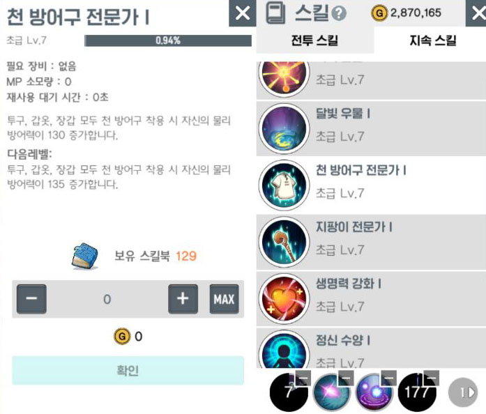 지속 스킬의 경우 저는 모두 다 골고루 레벨을 올리고 있습니다. 공격력 증가 / MP 최대량 증가 / 방어력 증가 / MP 회복량 증가 / MP 소모량 감소 등 모두 필요한 부분이라 생각되어 올리고 있으나, 다른 분들께서는 보다 더 필요하다고 생각되는 스킬에 투자하는 것이 더 효율적일 수도... 있을.. 것.. 같.. 네요 ◖⚆ᴥ⚆◗