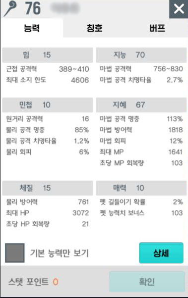 76까지 키우면서 스탯 초기화를 두 번 해본 저의 느낌으로는 "지능"의 경우 아이템 착용에 필요한 정도까지만 찍고, 나머지는 "지혜"에 모두 투자하자는 주의입니다.
