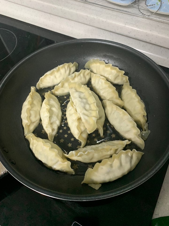 프라이팬에 기름을 넉넉히 둘러 만두를 튀겼습니다. 냉동되어 있던 거라 가운데 3개가 붙어버렸네요. 따흑 ꃼ.̫ ꃼ