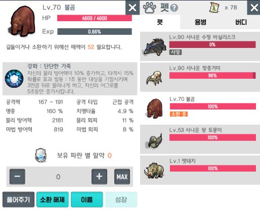 현재 사용중인 펫은 '불곰'입니다. 불곰은 '라비아스산'에서 만날 수 있는 몬스터이고 레벨은 90입니다. 높은 레벨답게 길들이기에 필요한 스탯은 '매력 : 52'이에요. (길들일 수 있는 펫 중에 가장 높은 매력을 요구합니다.)
