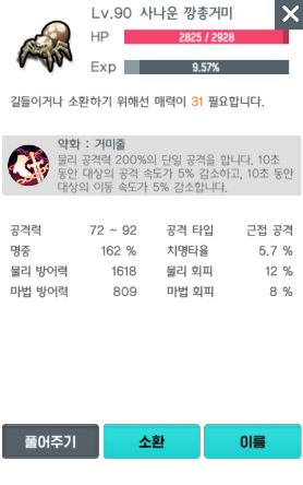 거미 역시 토룡이와 같이 물리 공격력 200%의 단일 공격을 하나, 10초 동안 대상의 공격 속도와 이동속도를 5% 감소시키는 능력이 있습니다. 빠른 공격력과 이동속도를 가진 몬스터에게 적용된다면 좋은 능력치라 생각됩니다.