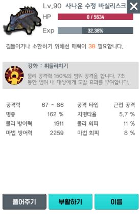 기존에 사용하였던 사나운 수정 바실리스크는 리자드맨 계곡에서 만날 수 있으며, 필요 매력 스탯은 38입니다. 바실리스크 역시 탱커 역할을 충분히 해주나, 곰에 비하면 공격력과 물리 방어력이 조금 더 떨어집니다. 대신 바실리스크는 마법 방어력도 높기 때문에 마법 피해를 주는 몬스터에게서는 더 탱커 역할을 잘해줄 거라 생각됩니다.