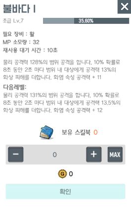 불바다 스킬은 다른 스킬과 다르게 범위 공격을 하는 스킬입니다. 일정 확률로 범위 내 대상에게 화상 피해를 더하기 때문에 모여있는 몬스터를 처치하는데 도움이 됩니다.