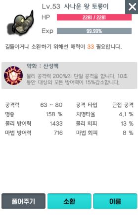 공격력이 높지는 않으나, 물리 공격력 200%의 단일 공격을 하며, 10초 동안 대상의 모든 방어력이 낮아지기 때문에 사용에 나쁘지 않은 펫이라 생각됩니다. 다만 공격형 펫 중 좋은 능력치를 가진 펫이 많기에 토룡이는 잘 사용하게 되지 않는 것 같습니다.