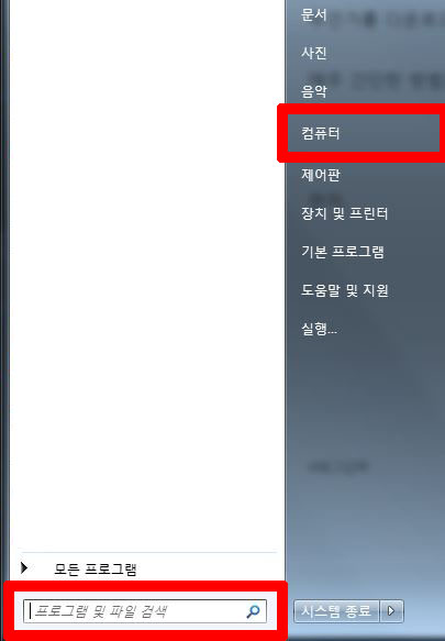 윈도우를 클릭하였을 때 '컴퓨터'를 찾을 수 없다면, 하단 검색창을 이용하시면 됩니다.