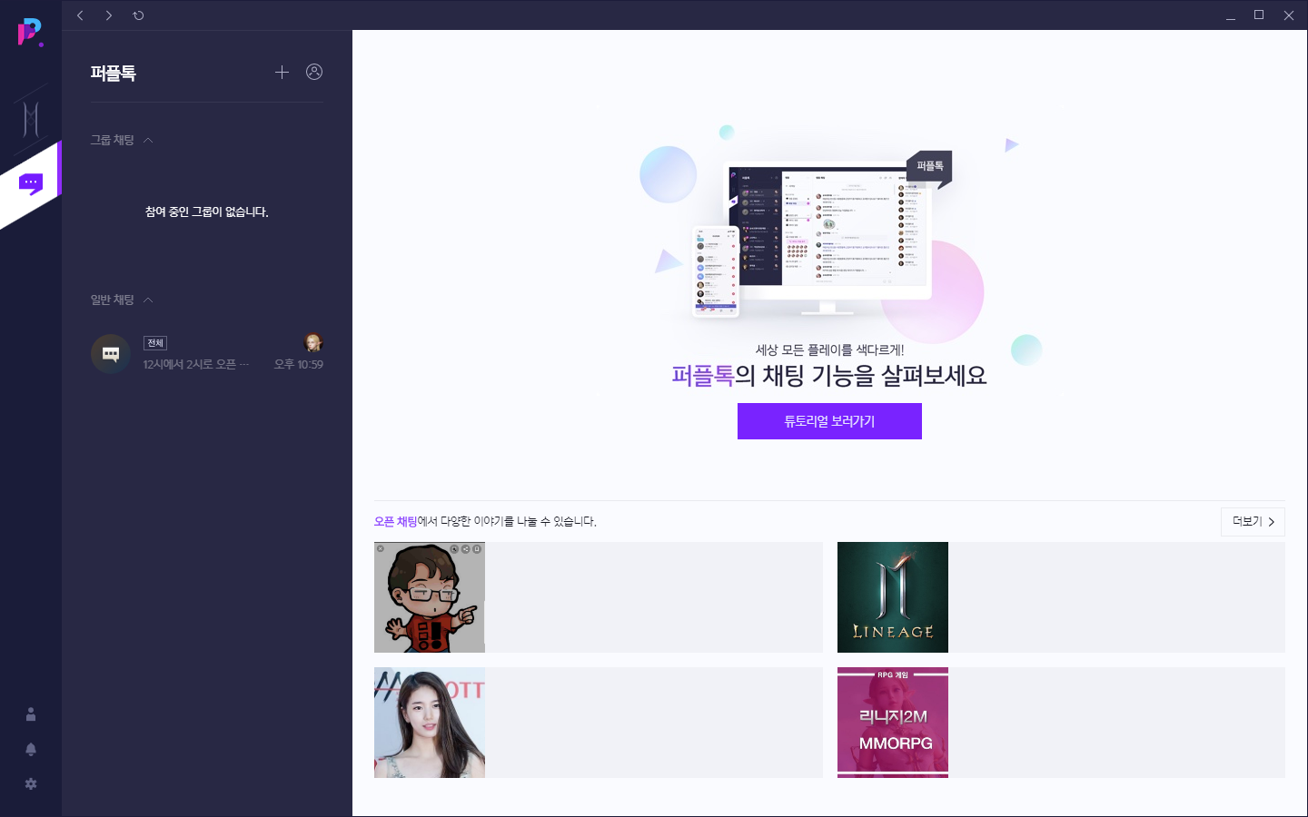 퍼플을 통해 제일 처음 제공되는 게임이 리니지2M이기 때문에 왼쪽 목록에는 아직 리니지2M 마크만이 있네요. 나중에 퍼플을 통해 다른 게임들도 제공되면 더 편하게 게임을 이용할 수 있을 것 같아요.