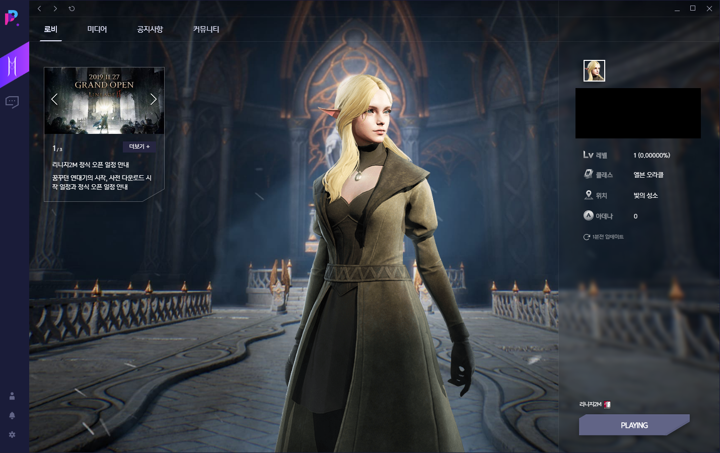 퍼플 화면에서는 게임 내 나의 캐릭터 레벨 / 경험치 / 클래스 / 위치 / 재화 등의 정보뿐 아니라 공지사항과 커뮤니티도 바로 확인하실 수 있답니다.