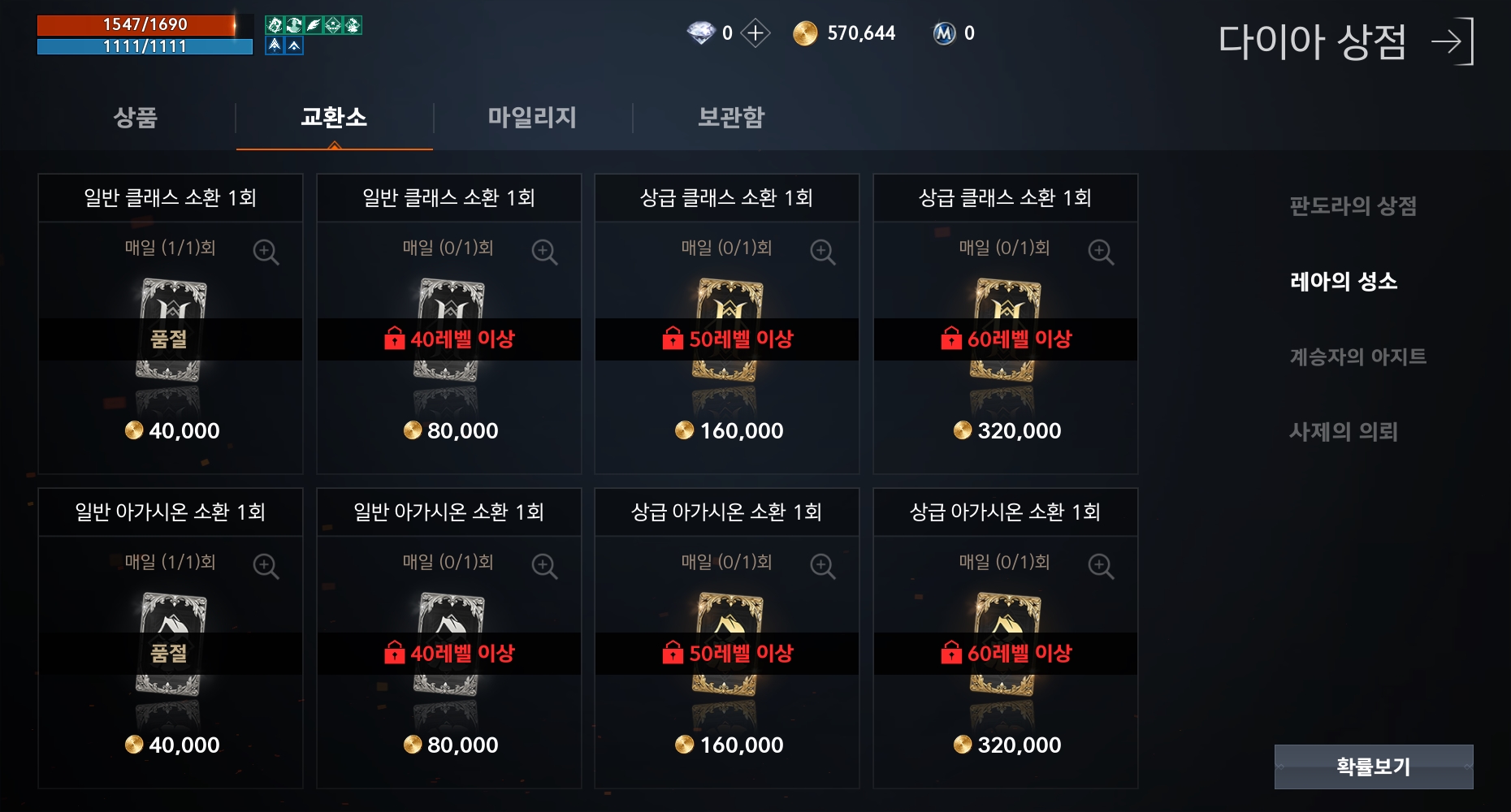 아데나를 사용해서 뽑는 것은 상점 - 교환소 - 레아의 성소에서 찾으실 수 있습니다. 큰 기대는 안 하시는 것이 좋습니다...