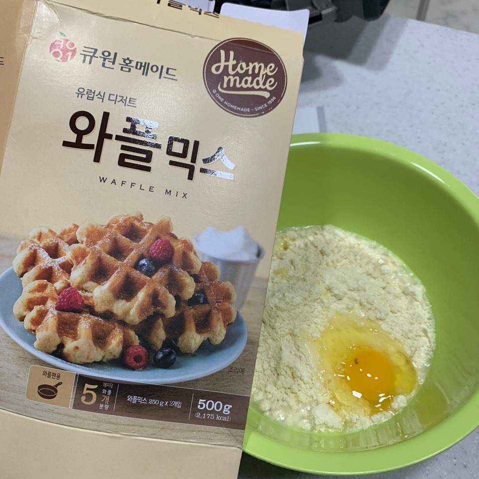 와플은 반죽을 만들기 어려워 마트에서 큐원 와플 믹스를 구매하였어요. 와플믹스 2봉이 들어있고, 5개 분량이라고 되어 있지만 쿠진아트 와플메이커는 뚱뚱한 와플(굵은 와플)이기에 한 봉지에 와플 두 개를 굽고 반 정도가 남습니다.