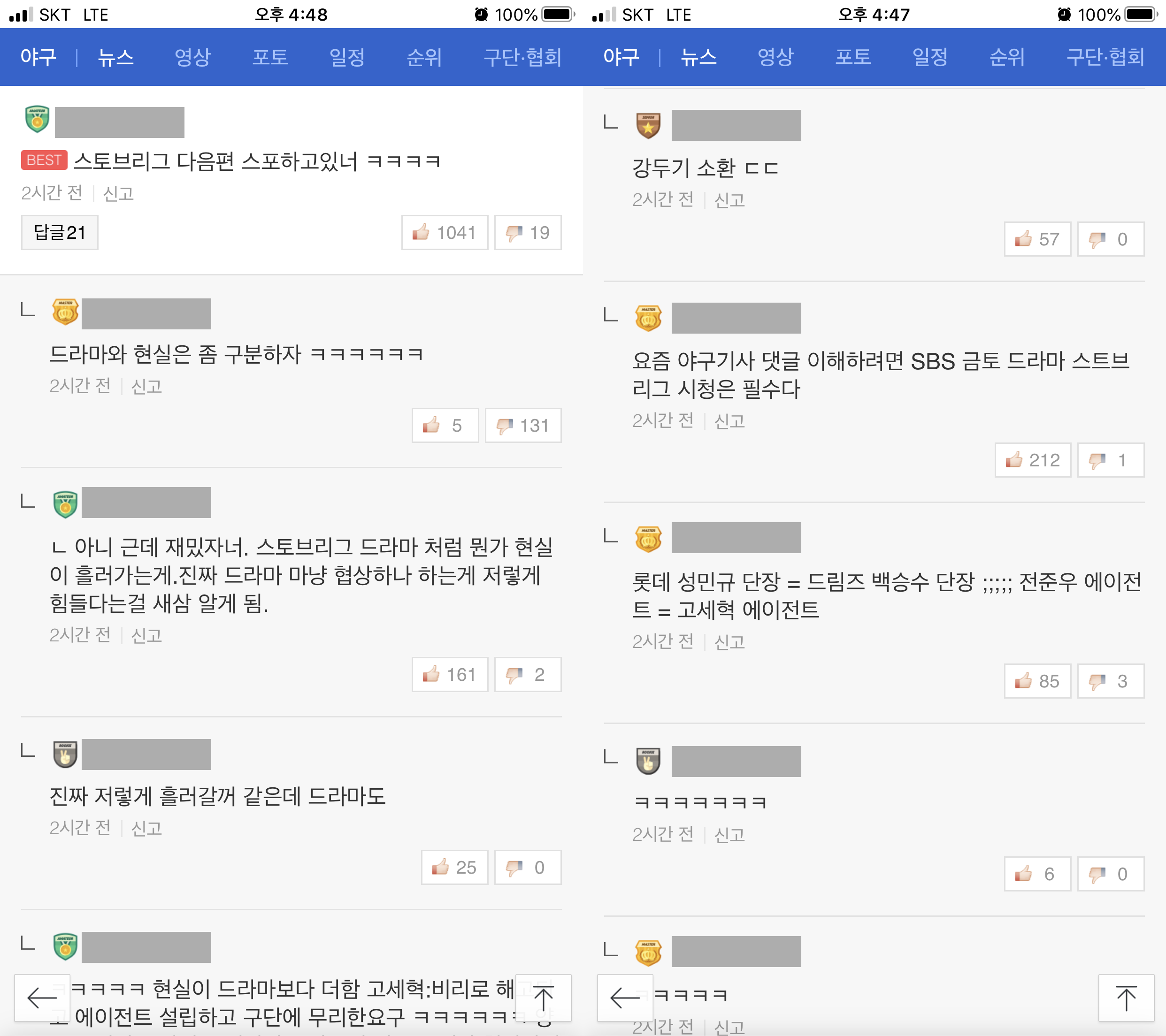 해당 내용을 가져와 보았습니다. (댓글은 온통 드라마 스토브리그에 대한 내용 밖에 없네요.)
