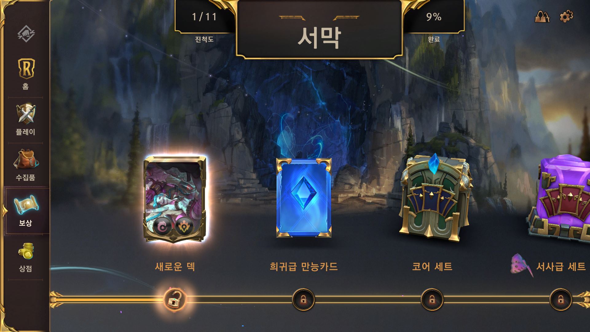 보상 탭에서 새로운 덱과 희구급 만능 카드 등을 수령하실 수 있습니다.