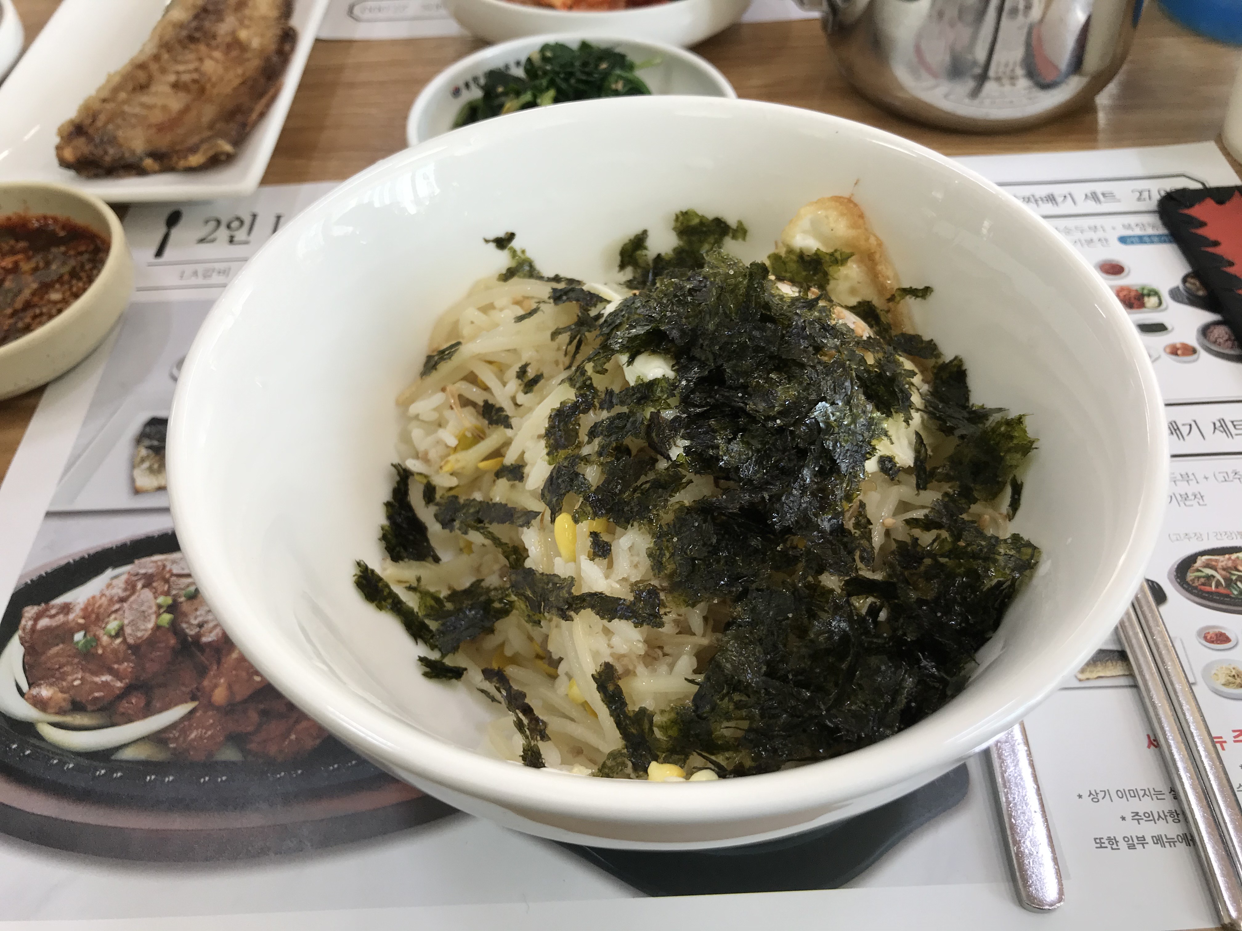 콩나물, 김, 그리고 계란(반숙) 정도가 전부입니다만 함께 나오는 양념과 버무려 먹으면 정말 일품입니다.