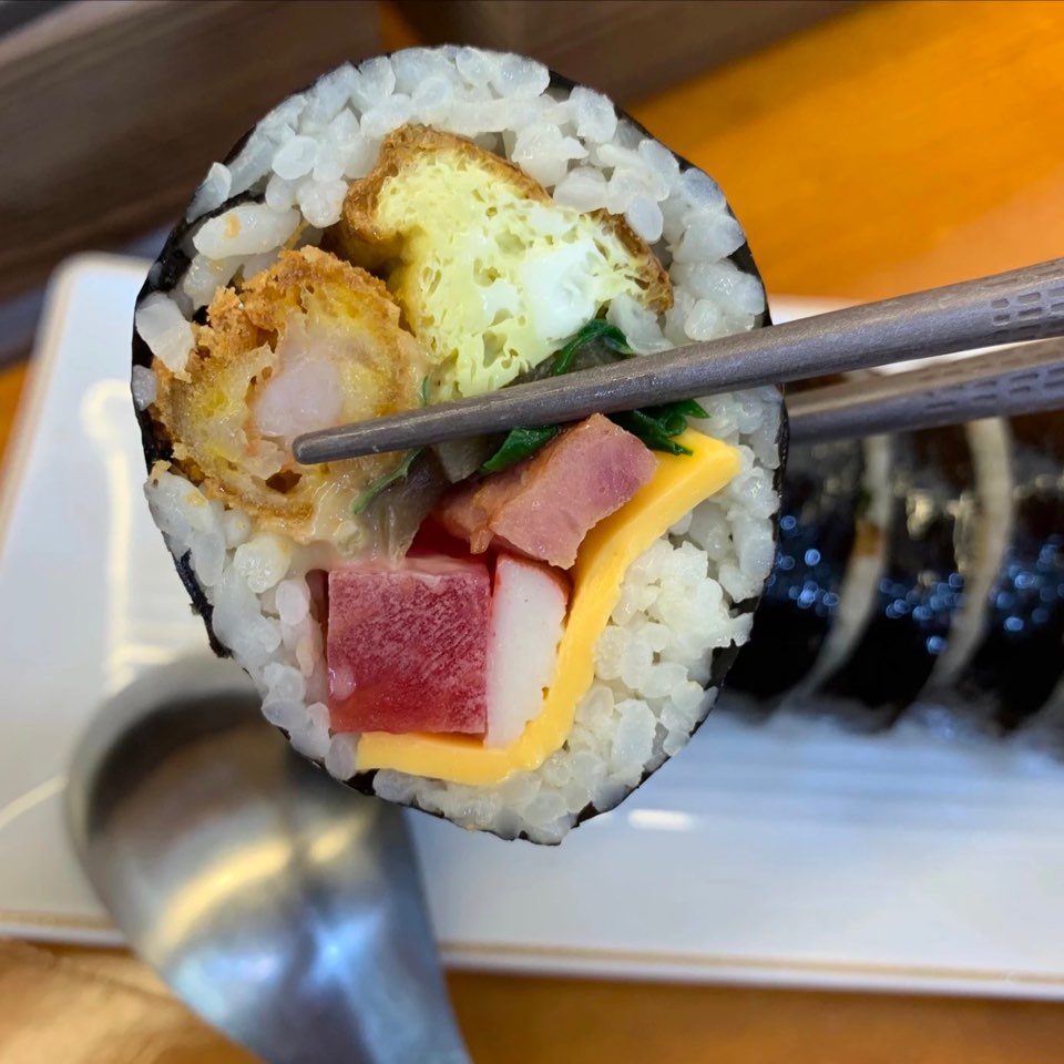 새치(새우+치즈) 김밥과 돈치(돈가스+치즈) 김밥을 먹어보았는데요. 튀김옷만 두꺼운 튀김이 아니라 바삭하고 머스터드? 소스가 같이 들어 있어 맛있는 조합이었습니다. 저는 치즈를 무척 좋아해서 새치/돈치의 조합은 너무 만족스러웠네요.